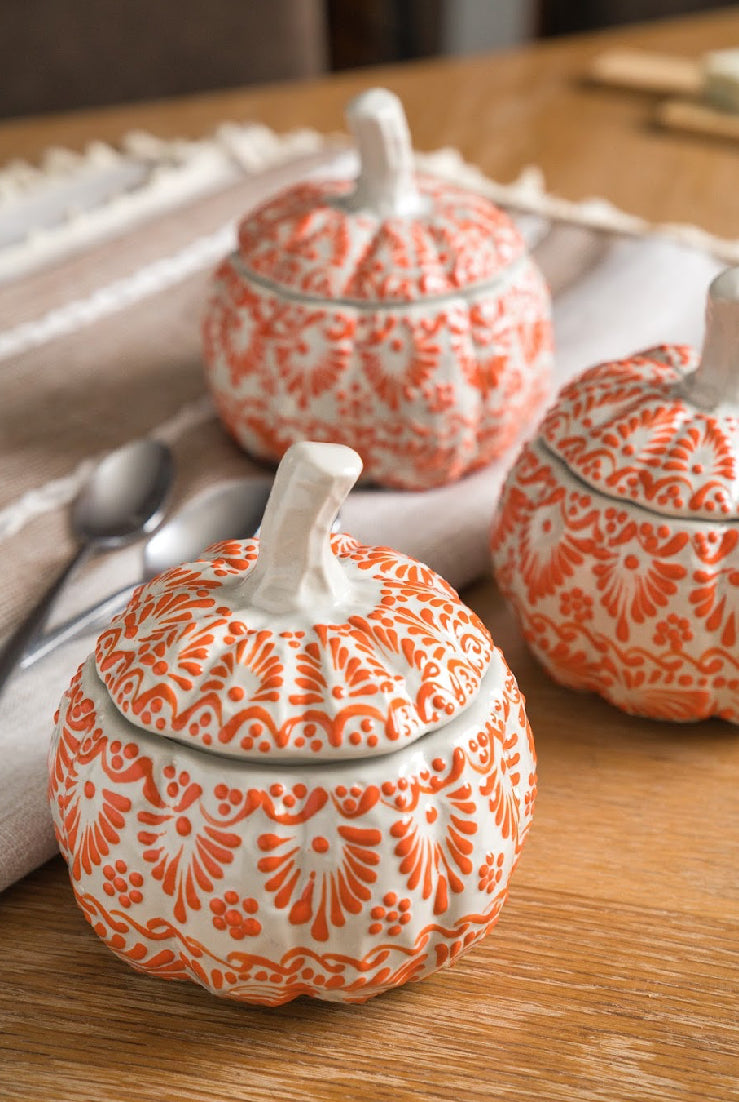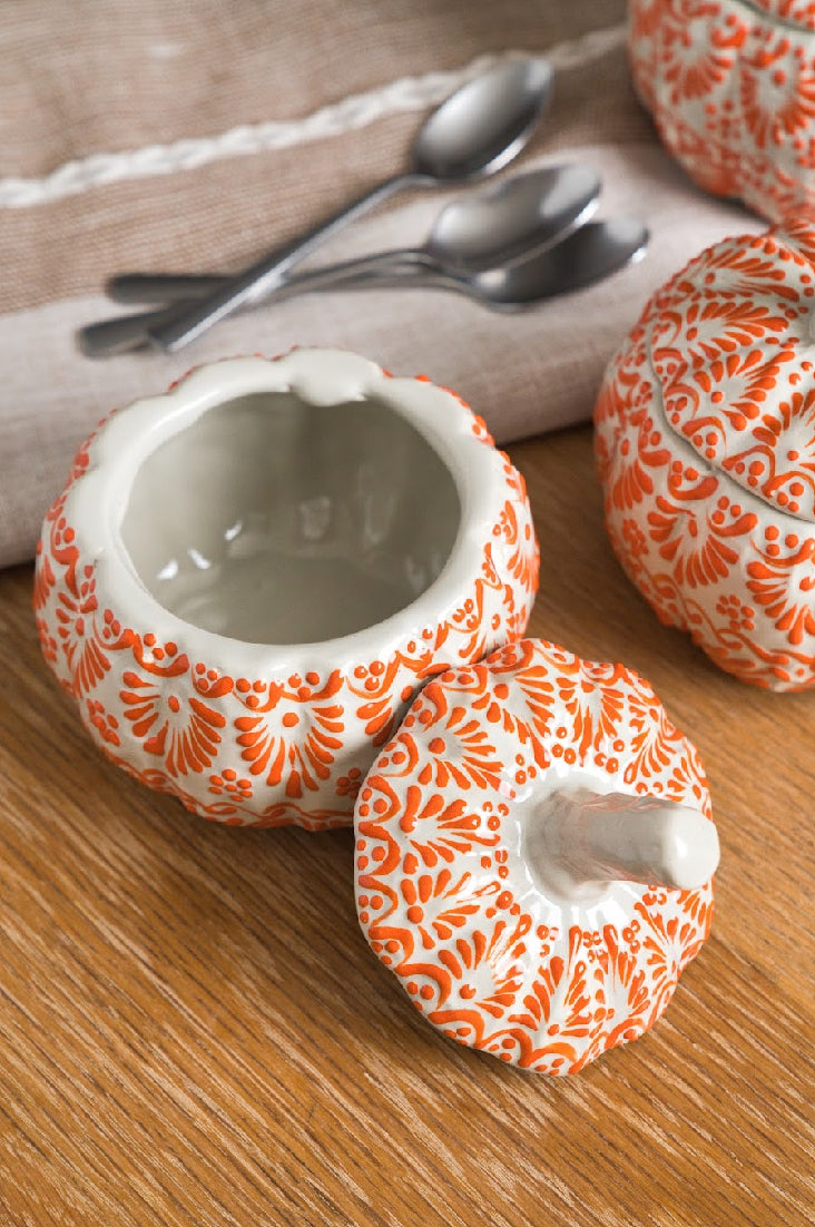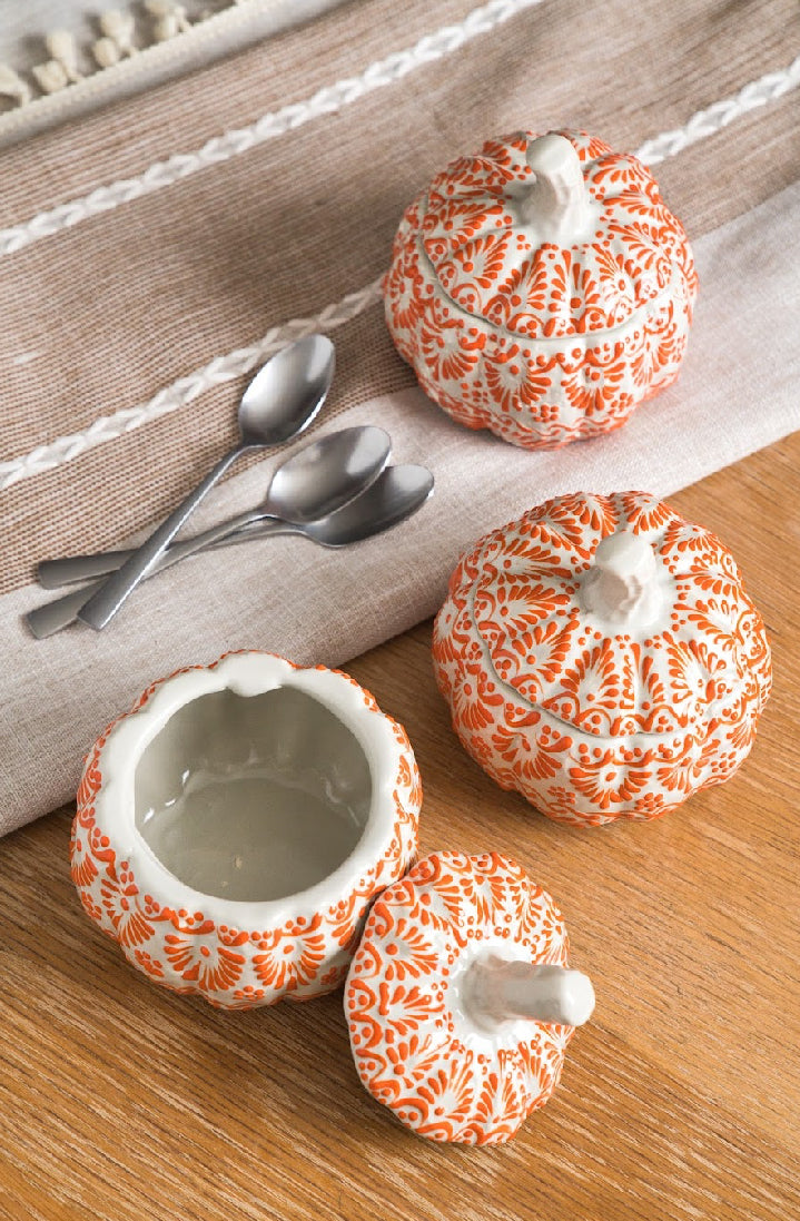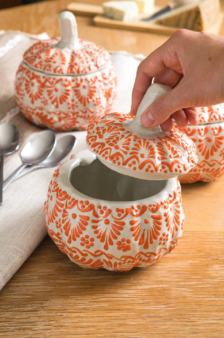 Inspirada en los tonos cálidos del otoño y la abundancia de la temporada, captura la esencia de las calabazas. Con una paleta de colores naranjas profundos, cada recipiente refleja la magia de la estación, convirtiendo cada momento en una celebración de tradición y naturaleza.